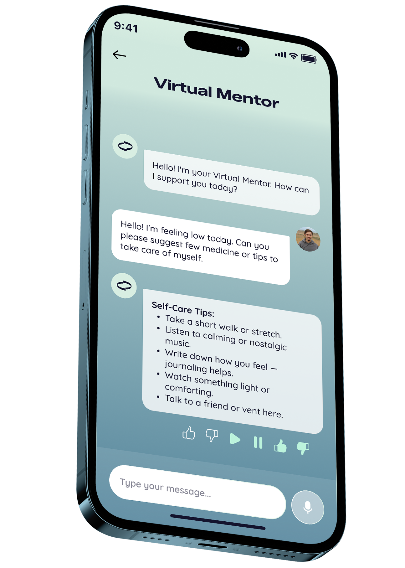 At the heart of the experience is the Virtual Mentor. It analyzes your progress, tracks your mood, and gives real time guidance to help you stay balanced and consistent. You can set goals, monitor achievements, and access tailored exercises in the wellness section to manage stress and improve focus.